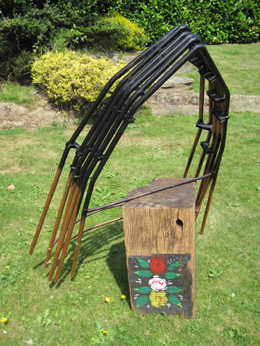 This was made for an exhibition celebrating the historic culture of the inland waterways. The rubberised copper represents the skeletised front of a narrowboat, and is resting on a representation of part of a lock gate. This has been painted to resemble a worn image typical of narrowboat and canal art. |